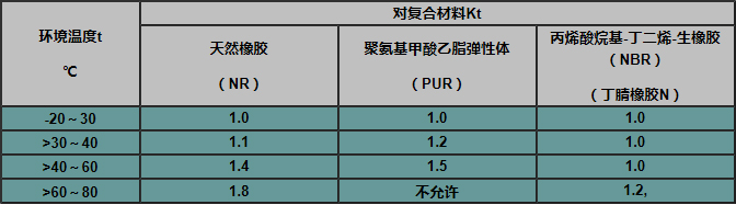 傳動系統選用帶非金屬彈性材料(橡膠)聯軸器時,應考慮在溫度影響下橡膠彈性材料強度降低的因素,以溫度系數Kt表示,見下表;溫度t與聯軸器的工作環境有關,在輻射熱的作用下,尤其要考慮Kt的影響。